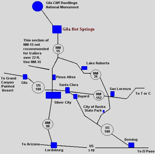 ALL RIGS LONGER THAN 20 FEET; Demning 180 west to highway 61 ( City of Rocks ) a right turn. Cross 152 by going left then right onto 35. Follow 35 to highway 15 another right. From Silver City take 180 East to 152 a left turn PAST the Stop light at Santa Clara. In about 14 miles take a left on 35 follow signs toward the Gila Cliff Dwellings. At highway 15 take a right and you have about 14 more miles to the RV Park.
